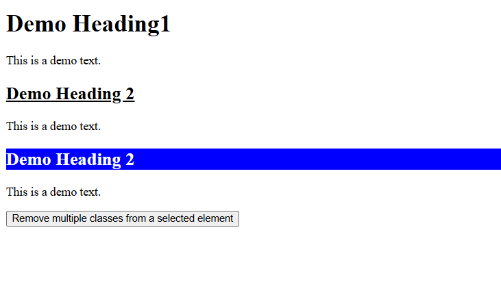 To remove multiple classes from a web page, use the removeClass() method in jQuery. In the example below, we will remove two classes, demo and example, here: